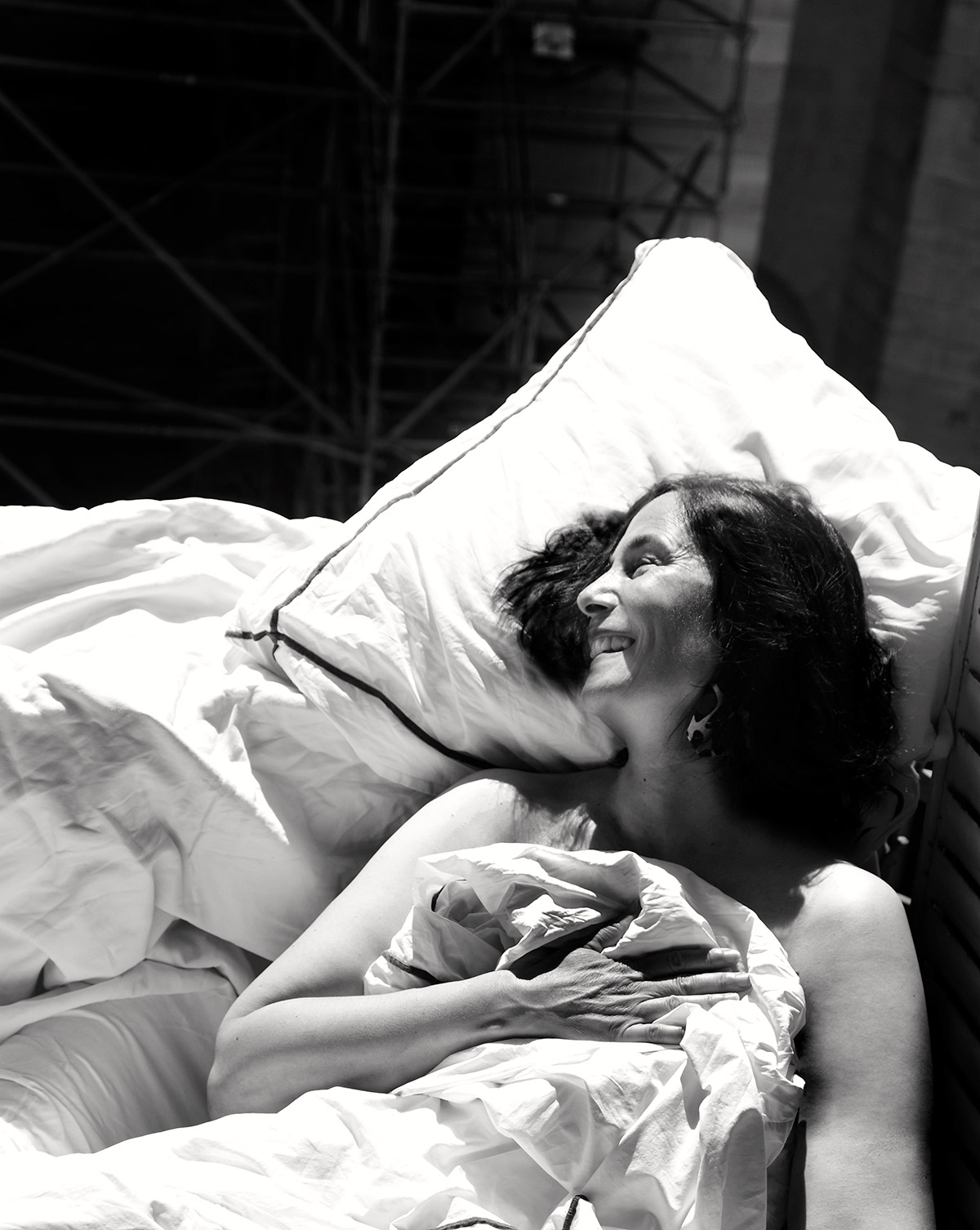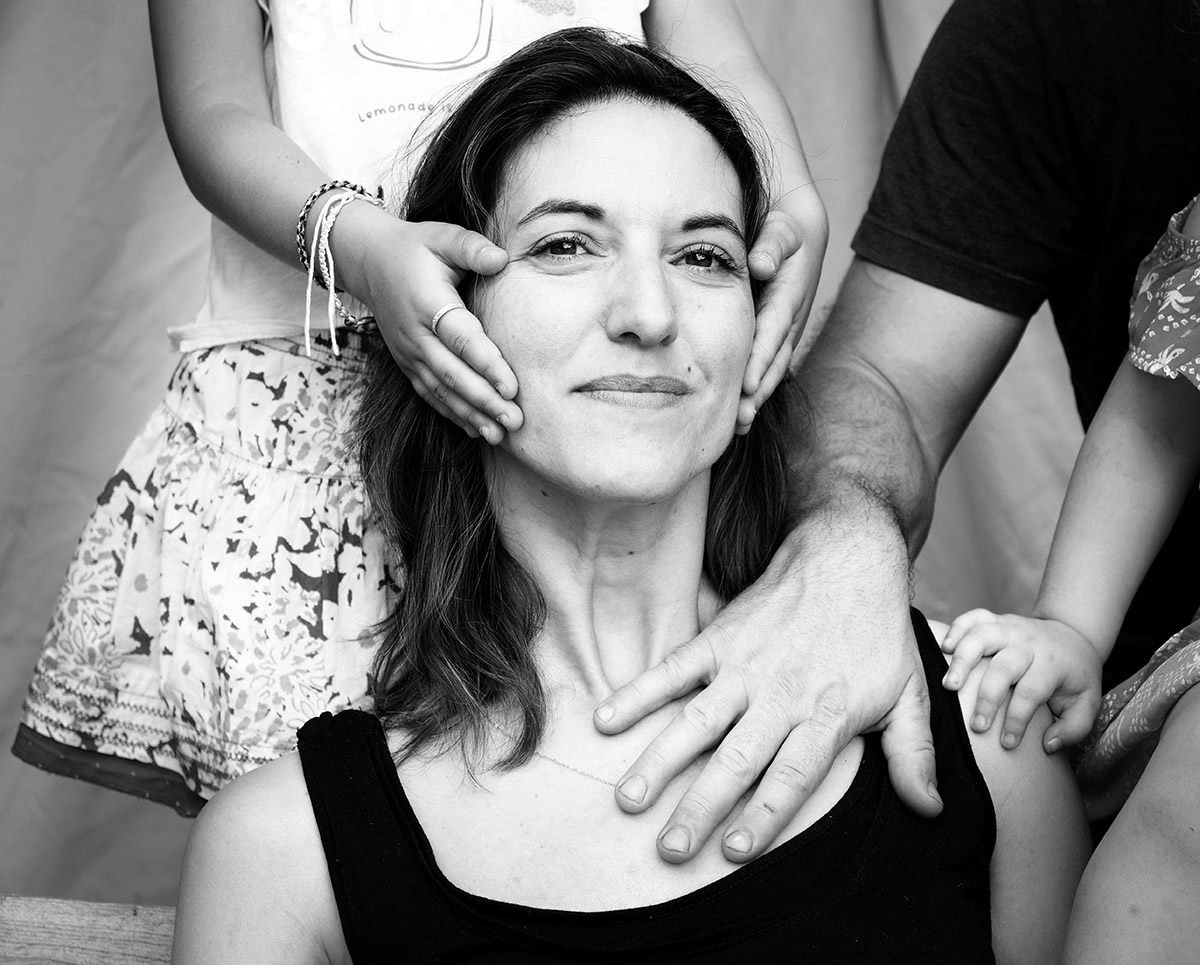« Mon cancer à moi a été invisible. Pas de chimio, pas de rayons. Un cancer plutôt rare, mais avec un bon pronostic, qui s’est soldé par une ablation du sein droit, avec reconstruction immédiate. Le choc a été violent mais rapide, l’impact psychologique bien plus dévastateur. Ces mains sont celles de mes filles et de leur père : pleines de vie, potelées, curieuses, créatives. Des mains qui dessinent, cuisinent, massent, caressent, tournent les pages des livres… Et qui, posées sur moi, apaisent. Ma famille ! Ensemble on a traversé « le cancer », à l’époque elles avaient 8 mois et 4 ans, et moi 37 ans. Cette photo, prise deux ans plus tard, me touche : j’y vois une femme sereine et victorieuse. C’est mon amie Sophie Chaulaic qui l’a prise. Son humour, sa joie et son affection sont essentiels à ma vie. Je lui suis reconnaissante d’avoir capturé cet instant. » Sophie Arutunian
