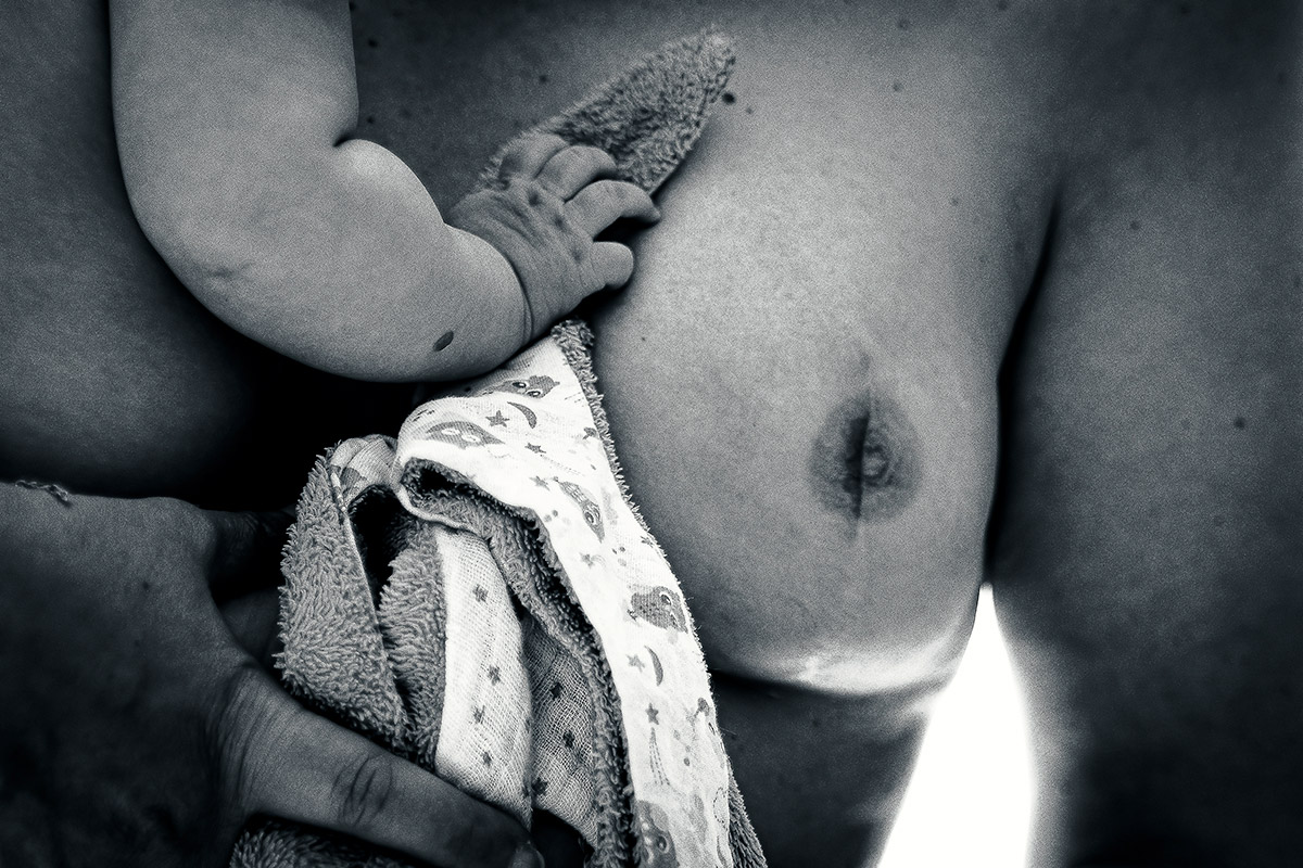« Mon épouse et moi étions les parents comblés d’Alice. Nous attendions avec joie l’arrivée de sa petite sœur, mais en janvier 2022, Louise née prématurément. Un mois après sa naissance, le diagnostic tombe : Lucille est atteinte d’un cancer du sein stade 3 dont les symptômes étaient masqués par la grossesse. Totale perte de sens : comment à la fois donner la vie et penser à la mort ? Et pourtant, l’arrivée prématurée de Louise fut en réalité un cadeau du ciel : elle a permis de débuter le protocole plus tôt et finalement, de sauver la vie de mon épouse. La mémoire de ses combats dans la peau, Lucille entretient tous les jours ce lien particulier tissé avec ses filles qui lui ont donné le courage de vivre. Fragilité d’un moment qui ne peut être rejoué, cet instantané veut fixer la fugacité de l’existence et de l’amour qui unit les êtres. Nous fêtons aujourd’hui ses 2 ans de rémission. Engagée dans l’association Jeune et rose, elle aide désormais les femmes au parcours similaire. » Florent