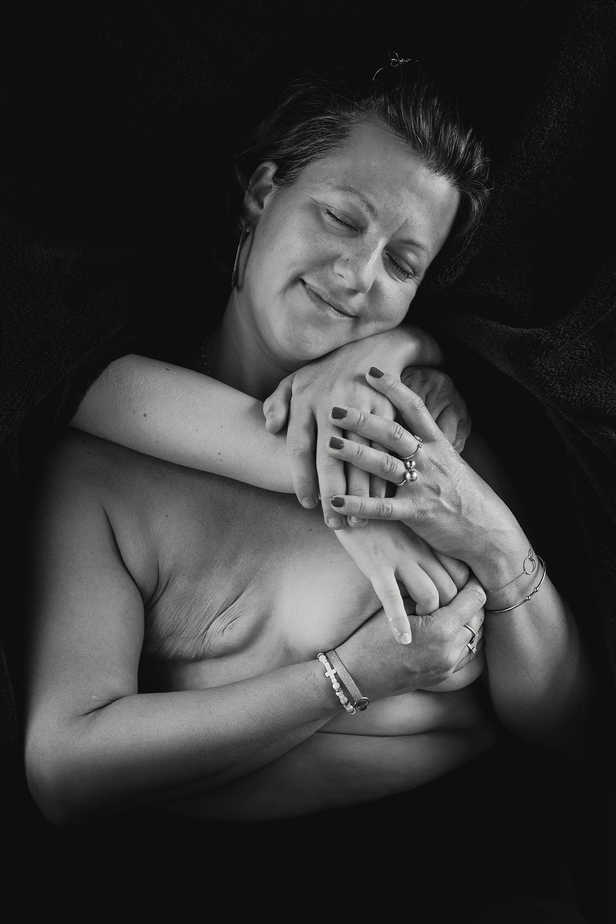 À l’aube de la double mastectomie, l’envie d’immortaliser ceux qui ont souvent été « trop petits », « trop ombiliqués pour allaiter »… Bientôt ils ne seront plus. Ce moment capturé en image pour mémoire. Cancer, tu auras eu temporairement mes cheveux, définitivement mes seins ; mais tu n’auras pas cet élan vital qui m’anime et me fait croire en ma bonne étoile. »