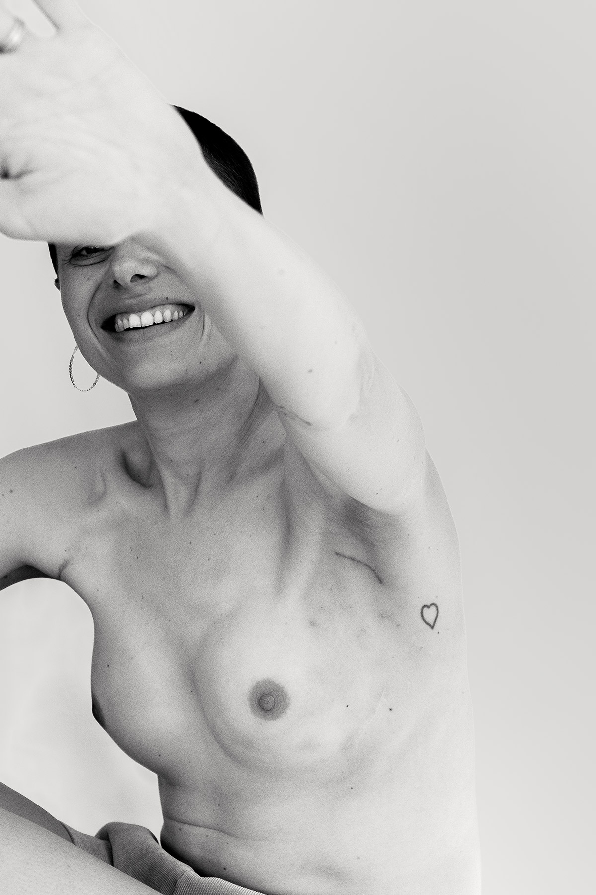 Un après-midi, j’accompagne Margaux à l’Institut Curie pour une séance de rayons. Nous tombons toutes les deux sur l’annonce du concours, avant de nous retrouver. Une coïncidence qui sonnait comme une évidence. Margaux se bat contre son deuxième cancer du sein, aujourd’hui en rémission. On parle d’acceptation de soi, de reconstruction, de l’après. Reprendre le cours de sa vie après une telle tornade. Ce concours représentait un vrai challenge pour nous deux. Elle est très engagée dans cette cause, mais pas à l’aise avec le nu (moi non plus). On a décidé de relever ce défi ensemble. J’allais m’approcher d’elle à travers mon objectif, pour tenter de l’aider à se réconcilier avec « ce corps ». Dans ce moment très intime, il fallait qu’on s’apprivoise. Et quoi de mieux que le rire pour y parvenir ?