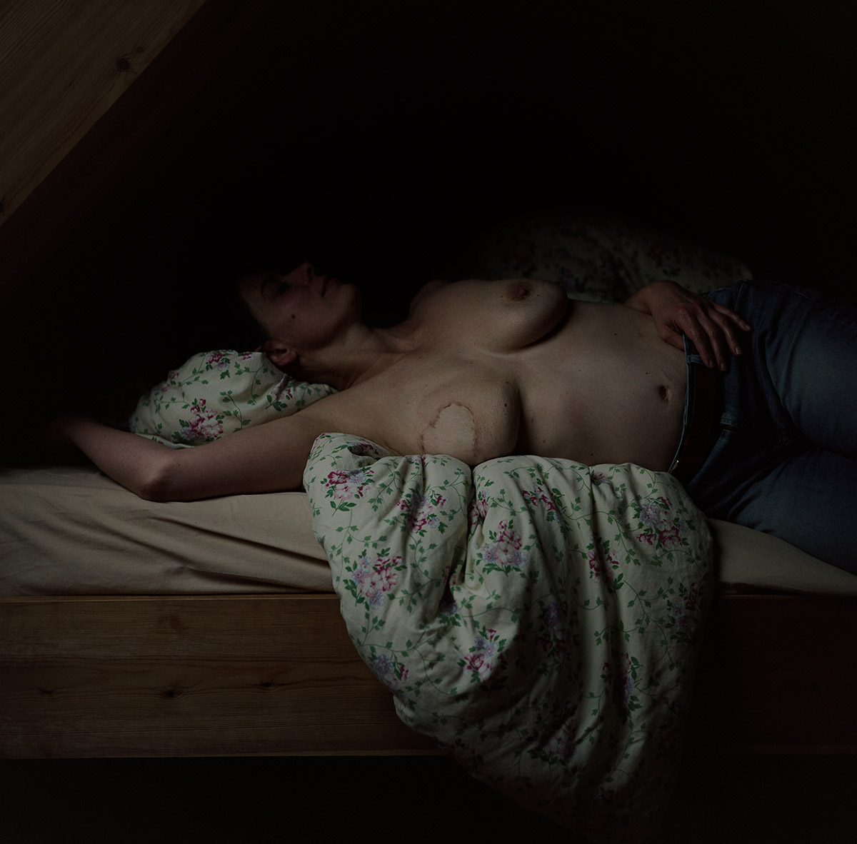 Je vis entre la France et la Turquie. J’ai réalisé cet autoportrait avec mon compagnon dans la chambre que j’occupe actuellement chez ma mère, alors qu’il me rendait visite à la suite de l’annonce du cancer. Mon entourage me donne force et énergie dans cette épreuve qui bouleverse notre rapport à soi et aux autres, et qui recentre sur l’essentiel.