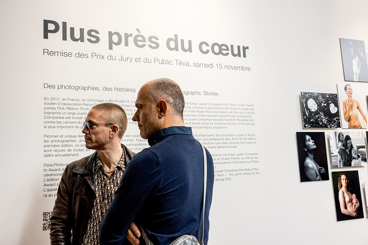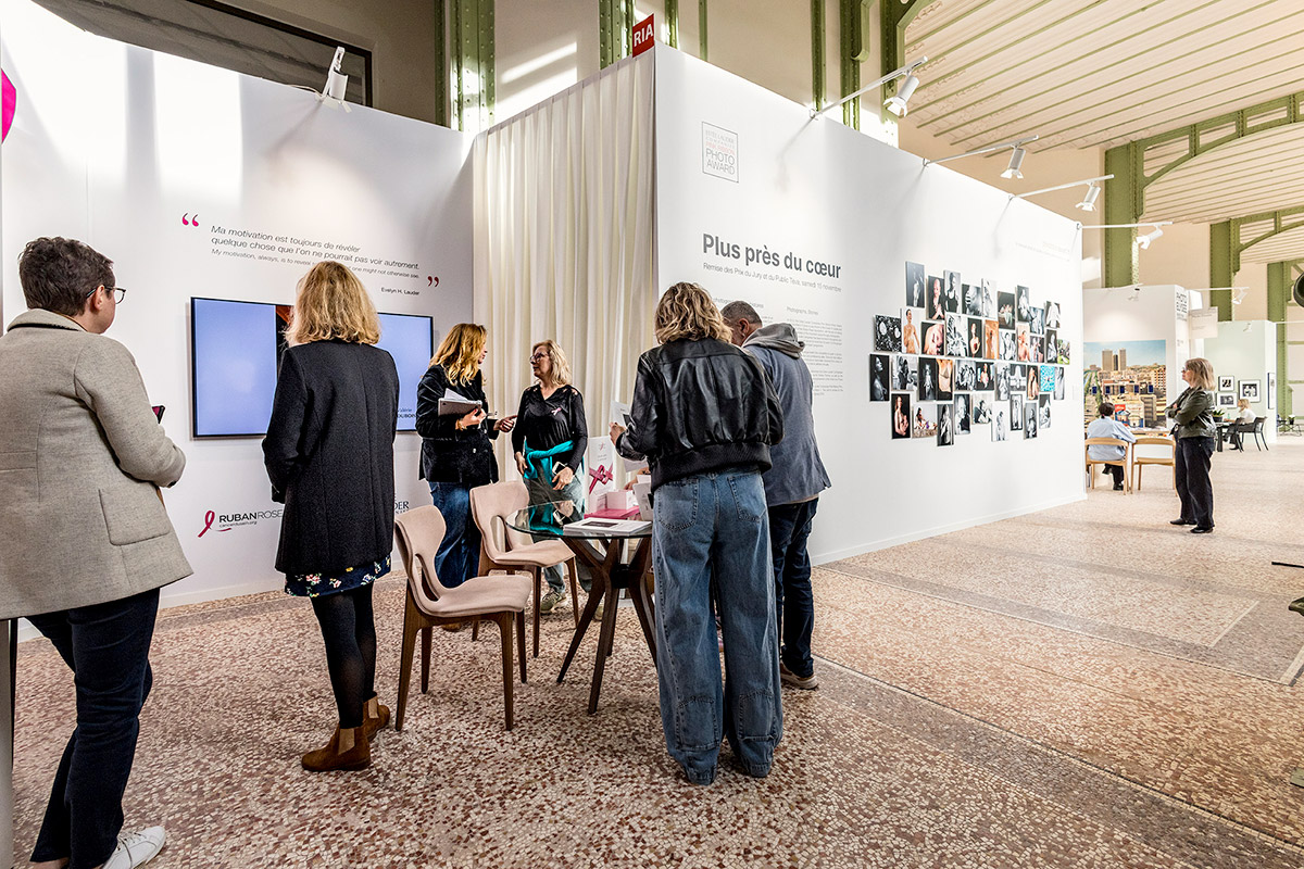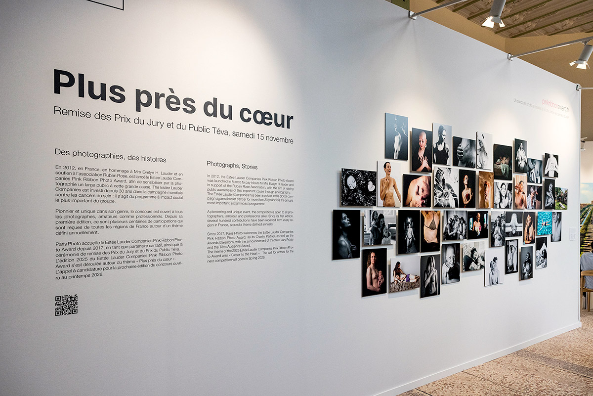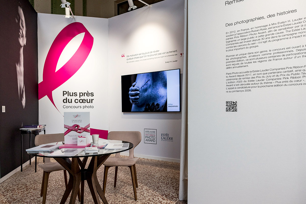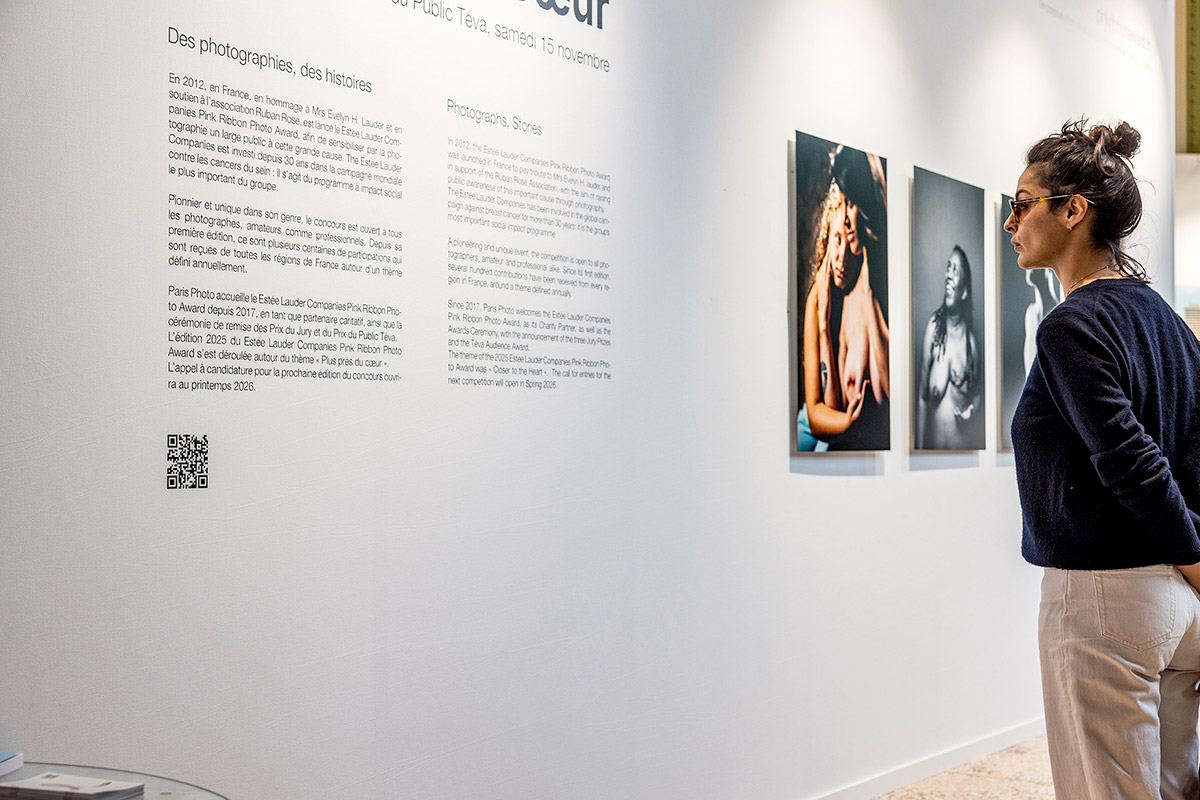 Ainsi, cette année encore, Paris Photo a mis généreusement un espace à la disposition du Estée Lauder Companies Pink Ribbon Photo Award, tout au long de la foire, du 13 au 16 novembre 2025. Situé sous la resplandissante nef du Grand Palais rénové, le stand du concours a été un point de rendez-vous à la fois artistique et d'information sur les cancers du sein et l'association Ruban Rose, pour les différents publics de la foire qui, cette année a battu des records de fréquentation avec plus de 75 000 visiteurs !